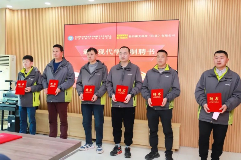 來自松谷激光機械裝配組、電氣裝配組、焊接工藝組等生產一線的多名資深工程師,正式受聘為睢寧中專的“企業師傅”,睢寧中專為松谷激光的企業師傅頒發現代學徒制師傅聘書,學生代表向企業師傅敬茶并行拜師禮。